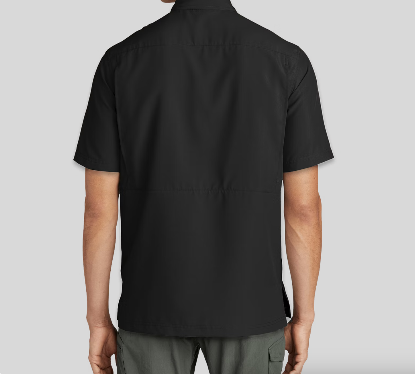 Made of 2.2-ounce, 100% polyester poplin Hidden button-down collar, two chest pockets and vented back panel with mesh.
